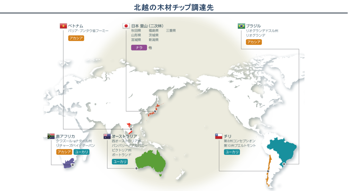 また、北越は木材チップの調達先にはチリや南アフリカ等、日本から遠く離れた国が含まれます。調達先を東南アジアに変えることで、コストを削減することが可能でしょう。